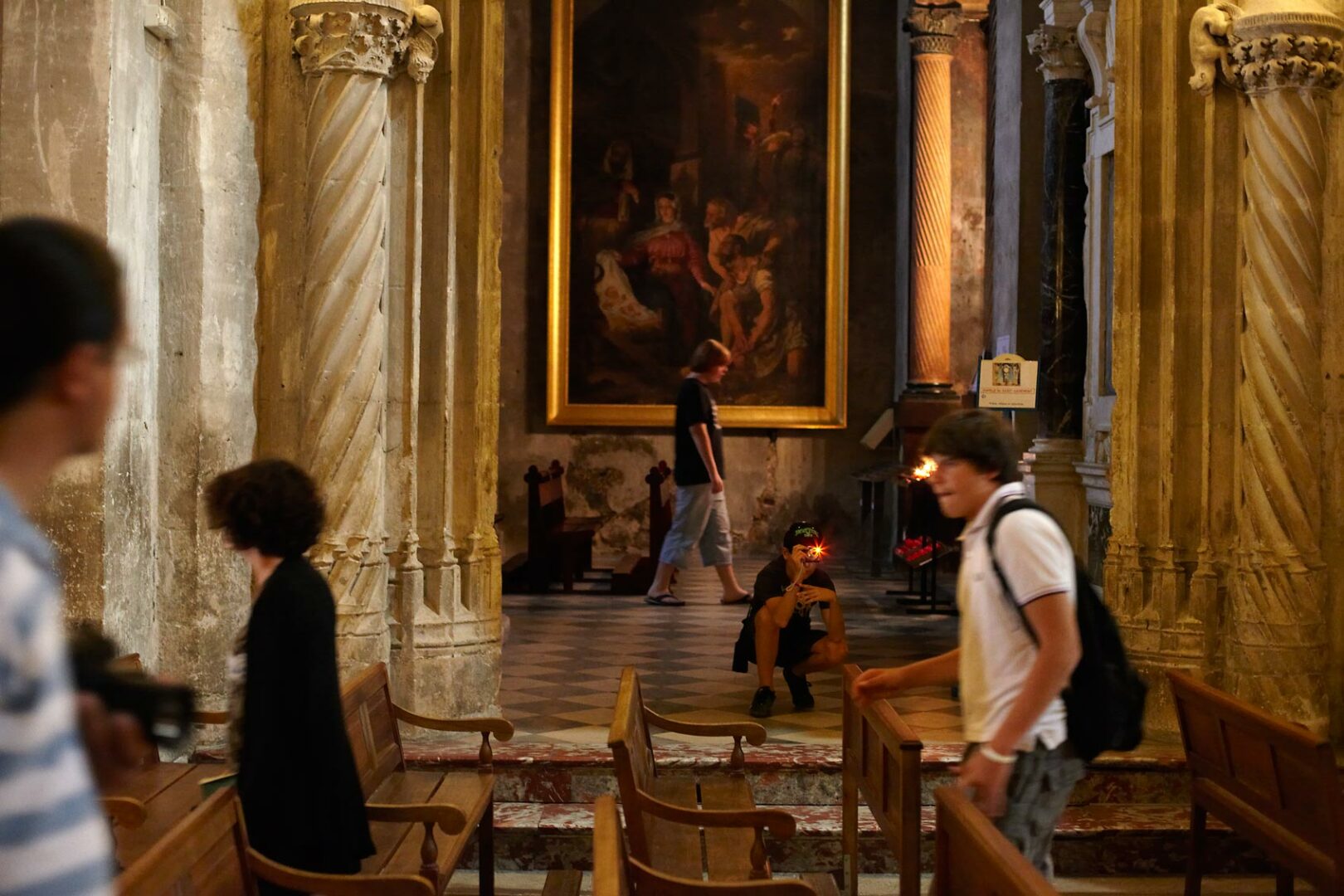 Il punto d’avvio del progetto è stata la vista a S Apollinare in Classe a Ravenna dove Gianni è stato attratto dagli atteggiamenti e posture dei numerosi visitatori fotografanti gli splendidi mosaici dell’abside. L’osservazione mediata dai vari strumenti tecnologici era ben evidenziata dai lampi dei flash. L’artificiosità delle luci elettroniche, nell’ambito simbolico dei gesti, provoca la restituzione di immagini differenti e parallele a quelle reali, distogliendo lo sguardo da una visione naturale.